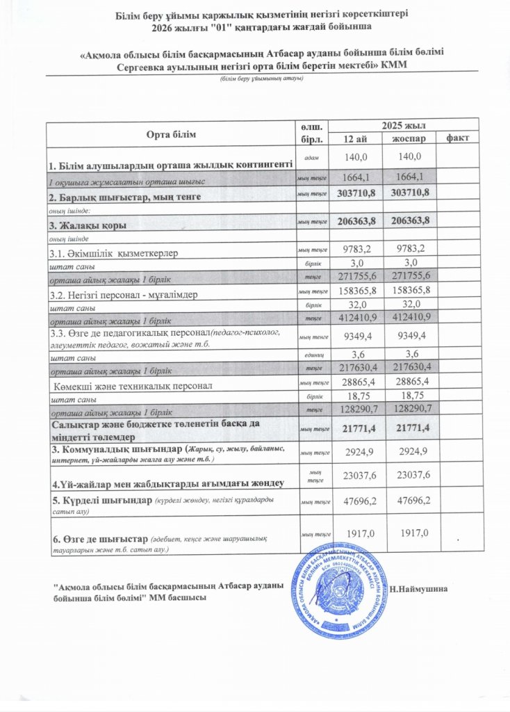 Білім беру ұйымы қаржылық қызметінің негізгі көрсеткіштері 2026 жылғы "01" қаңтардағы жағдай бойынша